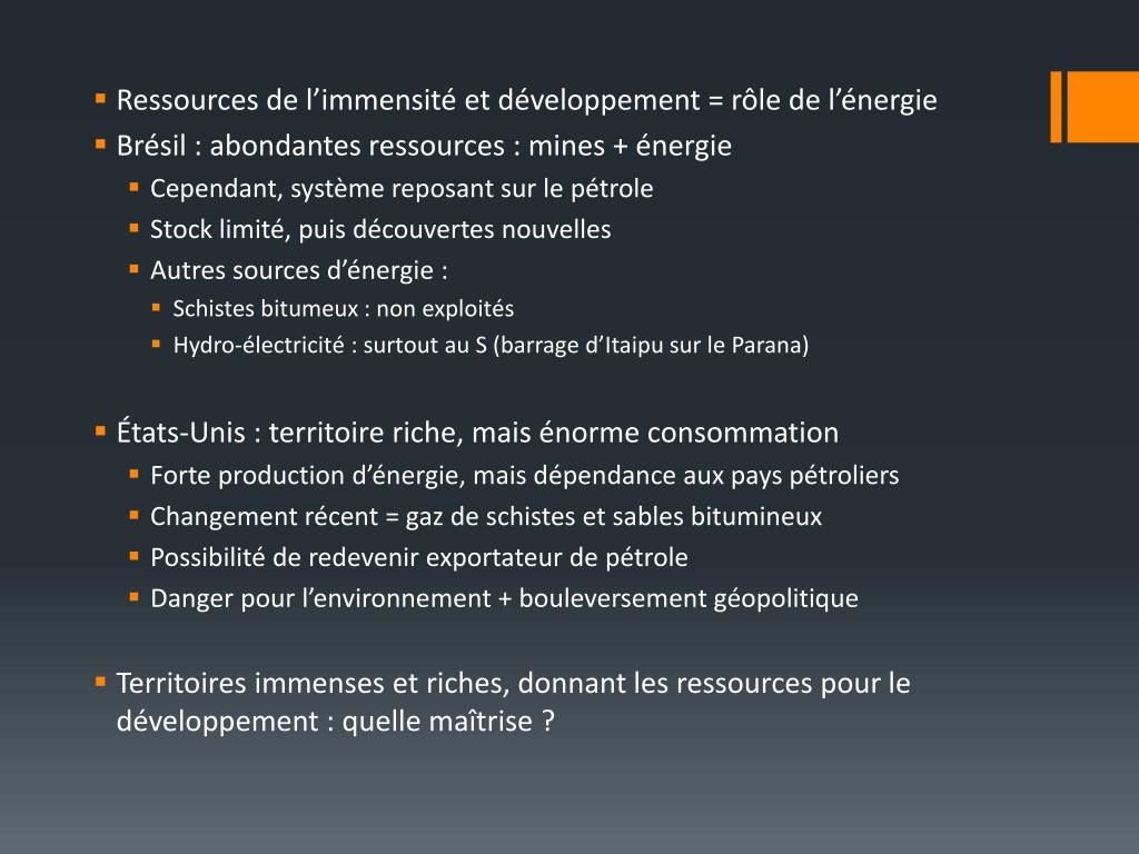 Ressources de l’immensité et développement = rôle de l’énergie • Brésil : abondantes ressources : mines + énergie • Cependant, système reposant sur le pétrole • Stock limité, puis découvertes nouvelles • Autres sources d’énergie : • Schistes bitumeux : non exploités • Hydro-électricité : surtout au S (barrage d’Itaipu sur le Parana) • États-Unis : territoire riche, mais énorme consommation • Forte production d’énergie, mais dépendance aux pays pétroliers • Changement récent = gaz de schistes et sables bitumineux • Possibilité de redevenir exportateur de pétrole • Danger pour l’environnement + bouleversement géopolitique • Territoires immenses et riches, donnant les ressources pour le développement : quelle maîtrise ?