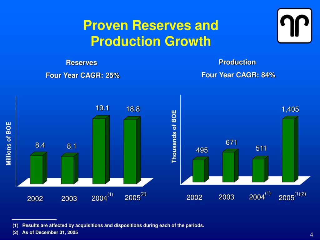 Proven Reserves and Production Growth Production Four Year CAGR: 84% Reserves Four Year CAGR: 25% 19.1 18.8 1,405 Thousands of BOE 671 8.4 8.1 Millions of BOE 511 495 2003 2004(1) 2002 2005(2) 2005(1)(2) 2004(1) 2003 2002 (1) Results are affected by acquisitions and dispositions during each of the periods. (2) As of December 31, 2005