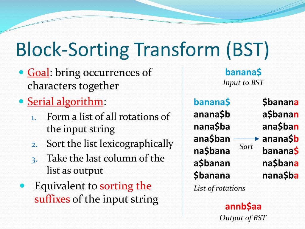 Block-Sorting Transform (BST) • Goal: bring occurrences of characters together • Serial algorithm: • Form a list of all rotations of the input string • Sort the list lexicographically • Take the last column of the list as output • Equivalent to sorting the suffixes of the input string banana$ Input to BST banana$ anana$b nana$ba ana$ban na$bana a$banan $banana $banana a$banan ana$ban anana$b banana$ na$bana nana$ba Sort List of rotations annb$aa Output of BST