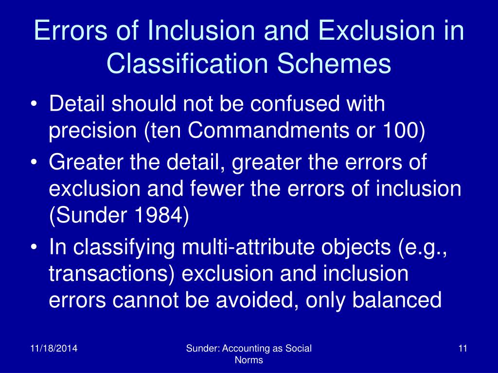 Errors of Inclusion and Exclusion in Classification Schemes • Detail should not be confused with precision (ten Commandments or 100) • Greater the detail, greater the errors of exclusion and fewer the errors of inclusion (Sunder 1984) • In classifying multi-attribute objects (e.g., transactions) exclusion and inclusion errors cannot be avoided, only balanced Sunder: Accounting as Social Norms