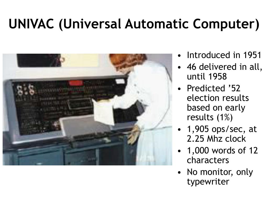 Introduced in 1951 46 delivered in all, until 1958 Predicted ’52 election results based on early results (1%) 1,905 ops/sec, at 2.25 Mhz clock 1,000 words of 12 characters No monitor, only typewriter UNIVAC (Universal Automatic Computer)