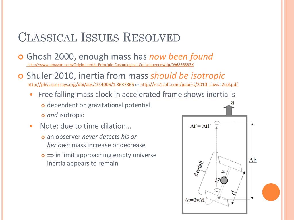 Classical Issues Resolved • Ghosh 2000, enough mass has now been found http://www.amazon.com/Origin-Inertia-Principle-Cosmological-Consequences/dp/096836893X • Shuler 2010, inertia from mass should be isotropichttp://physicsessays.org/doi/abs/10.4006/1.3637365 or http://mc1soft.com/papers/2010_Laws_2col.pdf • Free falling mass clock in accelerated frame shows inertia is • dependent on gravitational potential • and isotropic • Note: due to time dilation… • an observer never detects his orher own mass increase or decrease • in limit approaching empty universeinertia appears to remain
