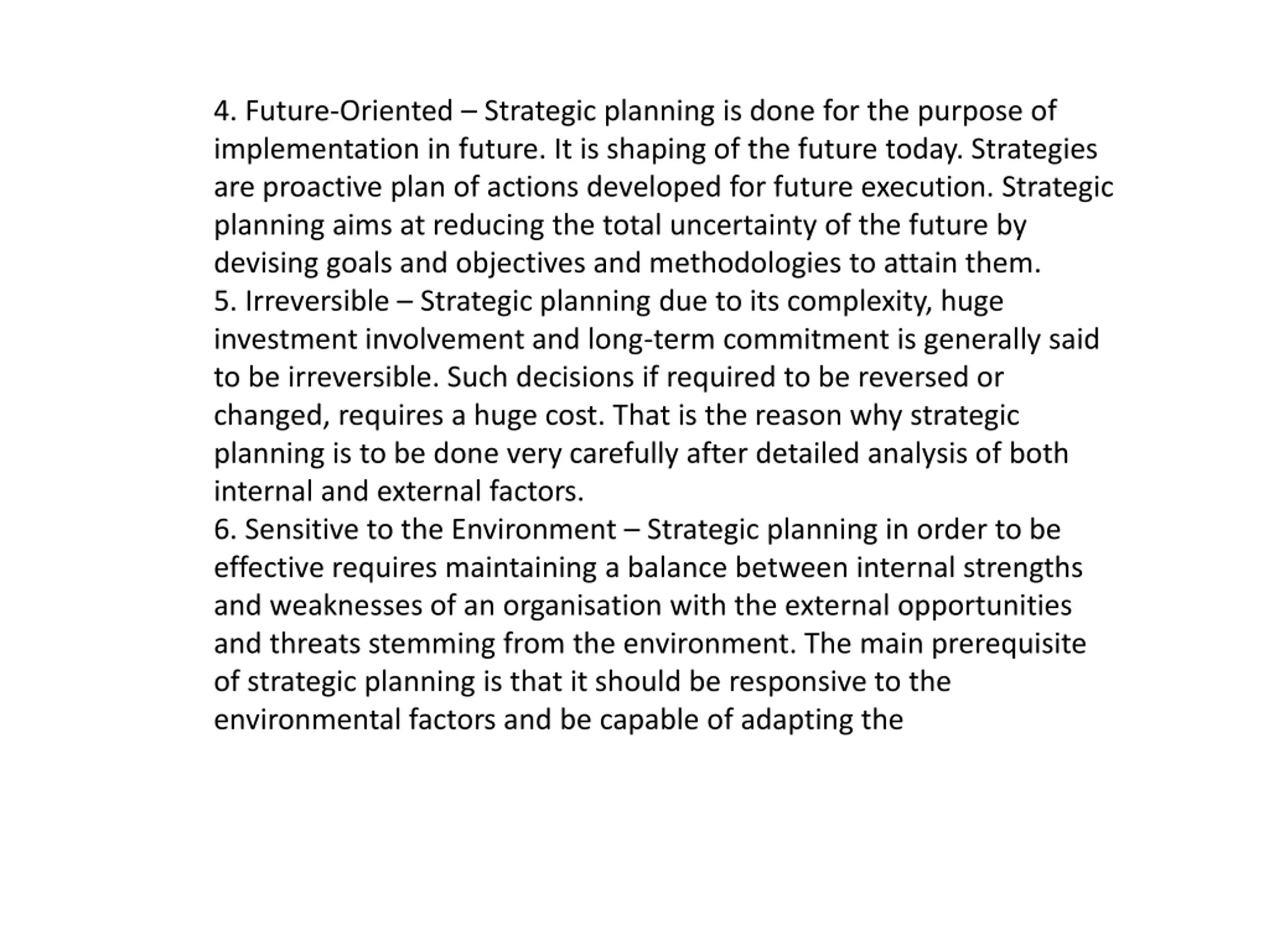 4. Future-Oriented – Strategic planning is done for the purpose of implementation in future. It is shaping of the future today. Strategies are proactive plan of actions developed for future execution. Strategic planning aims at reducing the total uncertainty of the future by devising goals and objectives and methodologies to attain them. 5. Irreversible – Strategic planning due to its complexity, huge investment involvement and long-term commitment is generally said to be irreversible. Such decisions if required to be reversed or changed, requires a huge cost. That is the reason why strategic planning is to be done very carefully after detailed analysis of both internal and external factors. 6. Sensitive to the Environment – Strategic planning in order to be effective requires maintaining a balance between internal strengths and weaknesses of an organisation with the external opportunities and threats stemming from the environment. The main prerequisite of strategic planning is that it should be responsive to the environmental factors and be capable of adapting the