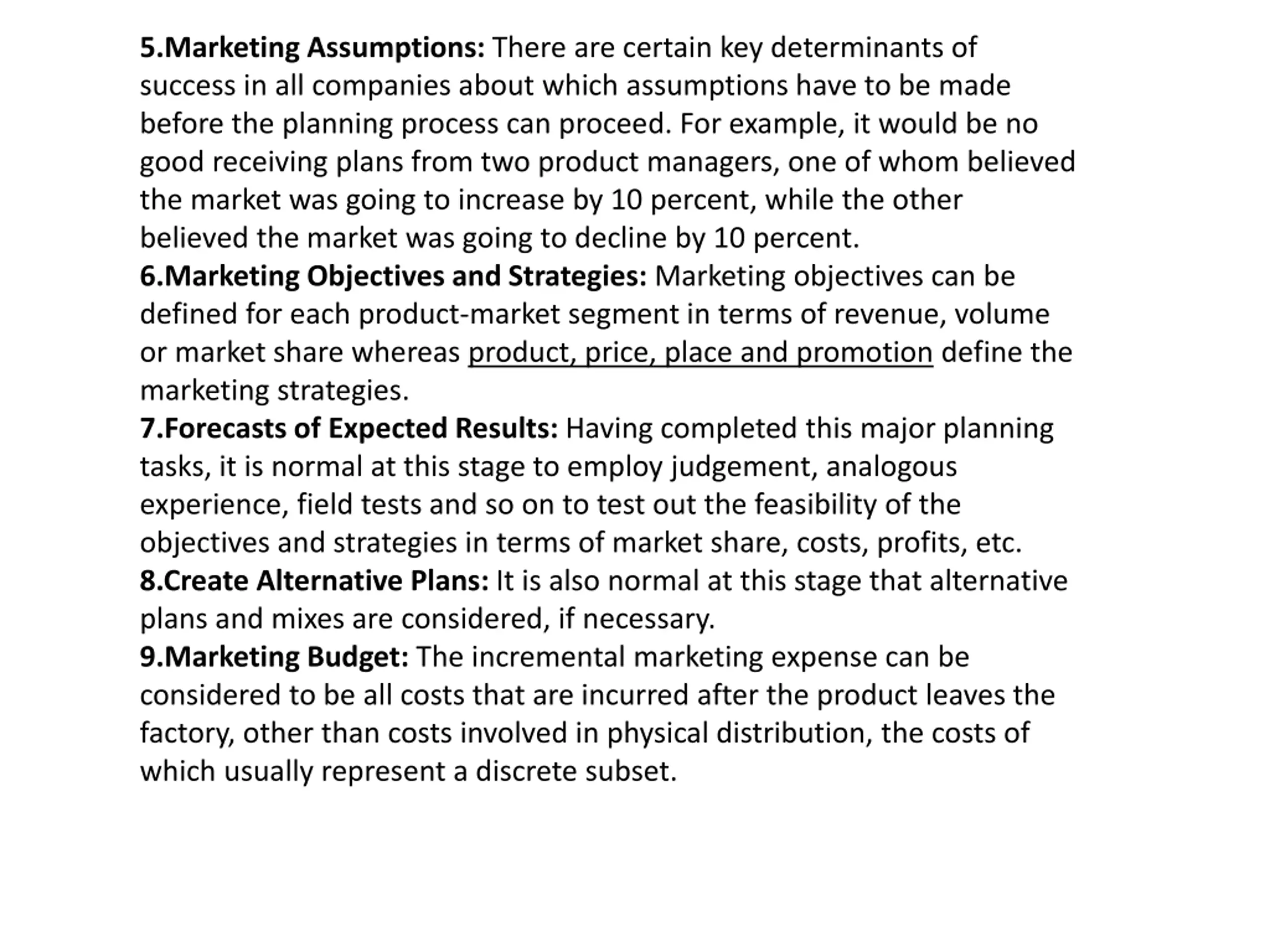 5.Marketing Assumptions: There are certain key determinants of success in all companies about which assumptions have to be made before the planning process can proceed. For example, it would be no good receiving plans from two product managers, one of whom believed the market was going to increase by 10 percent, while the other believed the market was going to decline by 10 percent. 6.Marketing Objectives and Strategies: Marketing objectives can be defined for each product-market segment in terms of revenue, volume or market share whereas product, price, place and promotion define the marketing strategies. 7.Forecasts of Expected Results: Having completed this major planning tasks, it is normal at this stage to employ judgement, analogous experience, field tests and so on to test out the feasibility of the objectives and strategies in terms of market share, costs, profits, etc. 8.Create Alternative Plans: It is also normal at this stage that alternative plans and mixes are considered, if necessary. 9.Marketing Budget: The incremental marketing expense can be considered to be all costs that are incurred after the product leaves the factory, other than costs involved in physical distribution, the costs of which usually represent a discrete subset.