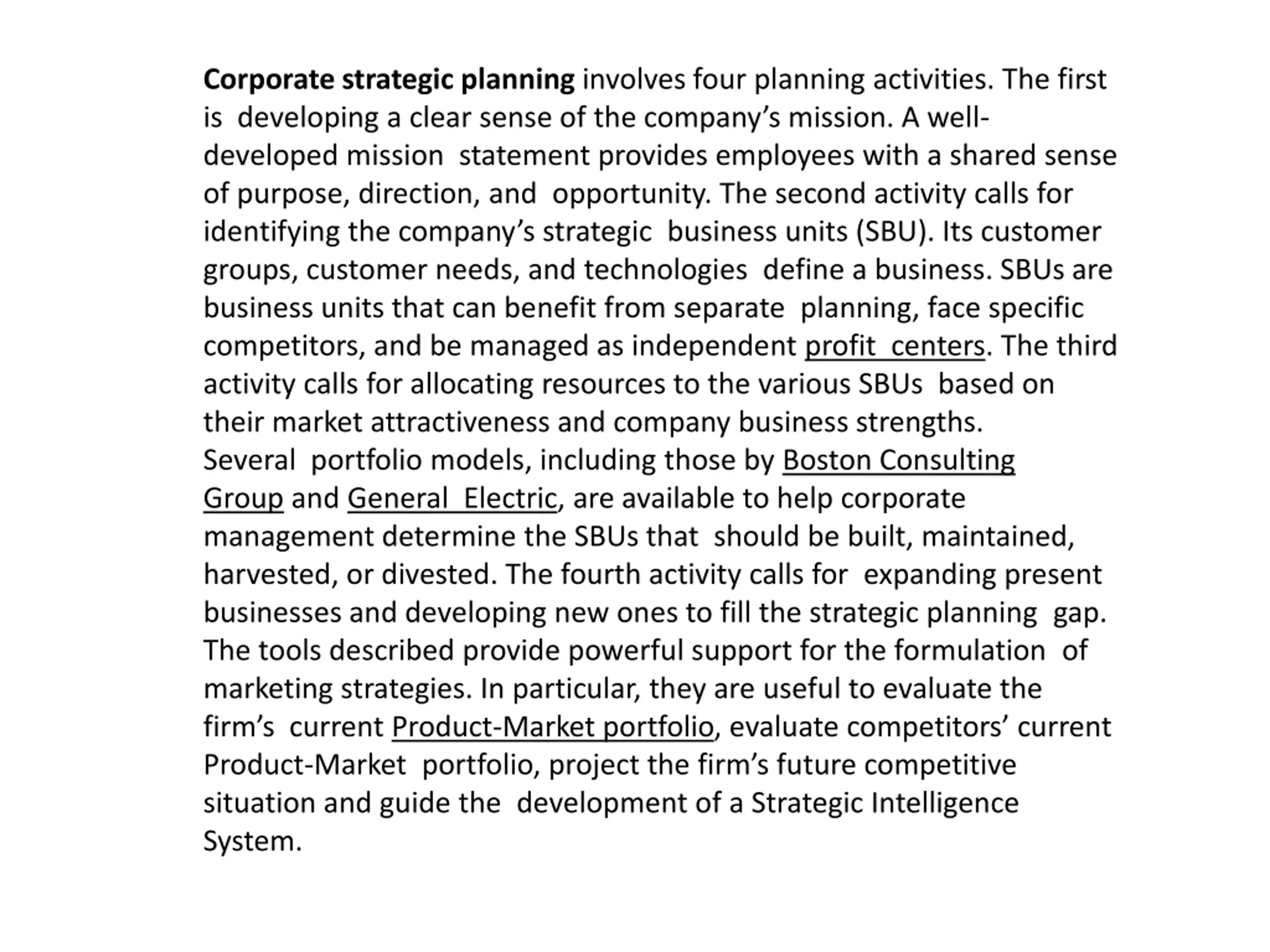 Corporate strategic planning involves four planning activities. The first is developing a clear sense of the company’s mission. A well- developed mission statement provides employees with a shared sense of purpose, direction, and opportunity. The second activity calls for identifying the company’s strategic business units (SBU). Its customer groups, customer needs, and technologies define a business. SBUs are business units that can benefit from separate planning, face specific competitors, and be managed as independent profit centers. The third activity calls for allocating resources to the various SBUs based on their market attractiveness and company business strengths. Several portfolio models, including those by Boston Consulting Group and General Electric, are available to help corporate management determine the SBUs that should be built, maintained, harvested, or divested. The fourth activity calls for expanding present businesses and developing new ones to fill the strategic planning gap. The tools described provide powerful support for the formulation of marketing strategies. In particular, they are useful to evaluate the firm’s current Product-Market portfolio, evaluate competitors’ current Product-Market portfolio, project the firm’s future competitive situation and guide the development of a Strategic Intelligence System.