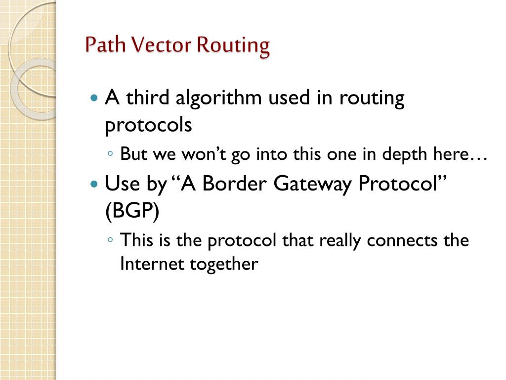 Path Vector Routing • A third algorithm used in routing protocols • But we won’t go into this one in depth here… • Use by “A Border Gateway Protocol” (BGP) • This is the protocol that really connects the Internet together