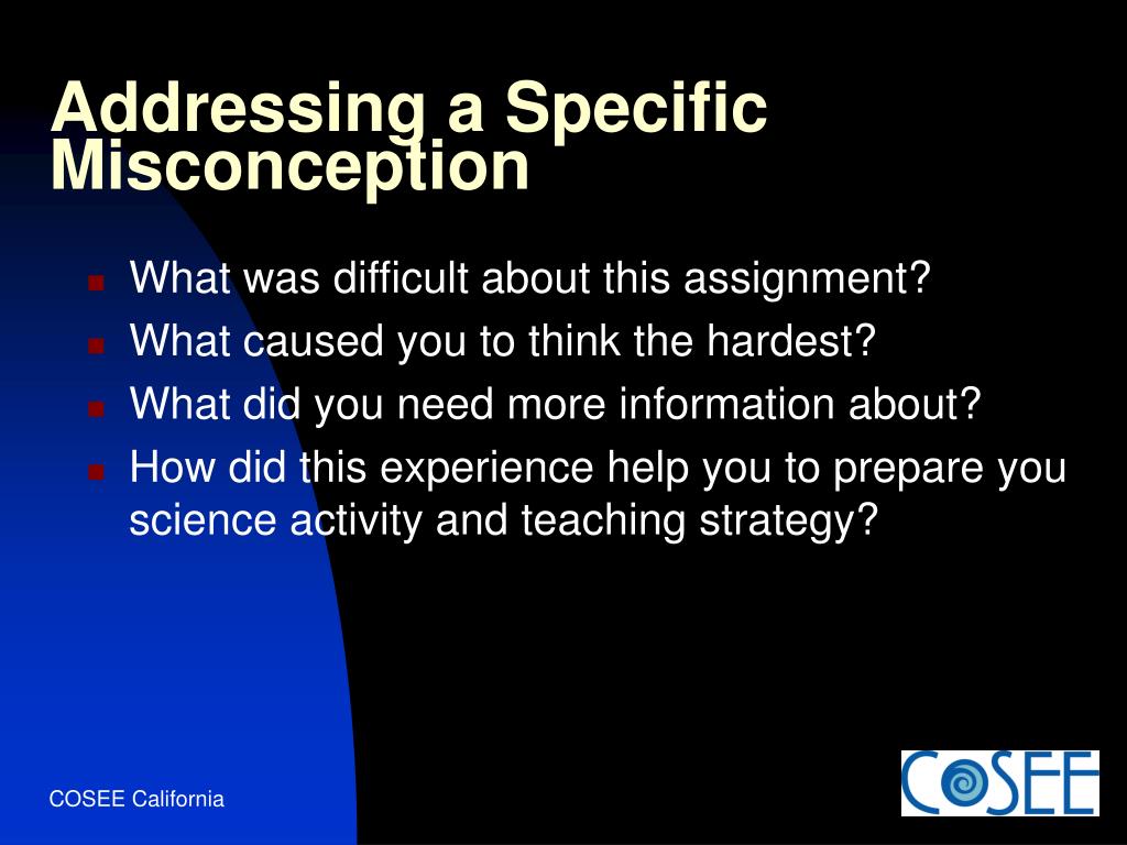 Addressing a Specific Misconception • What was difficult about this assignment? • What caused you to think the hardest? • What did you need more information about? • How did this experience help you to prepare you science activity and teaching strategy?