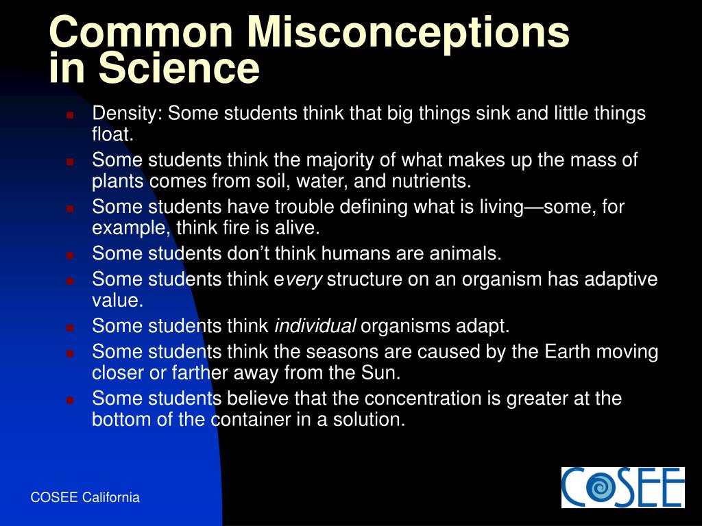 Common Misconceptions in Science • Density: Some students think that big things sink and little things float. • Some students think the majority of what makes up the mass of plants comes from soil, water, and nutrients. • Some students have trouble defining what is living—some, for example, think fire is alive. • Some students don’t think humans are animals. • Some students think every structure on an organism has adaptive value. • Some students think individual organisms adapt. • Some students think the seasons are caused by the Earth moving closer or farther away from the Sun. • Some students believe that the concentration is greater at the bottom of the container in a solution.