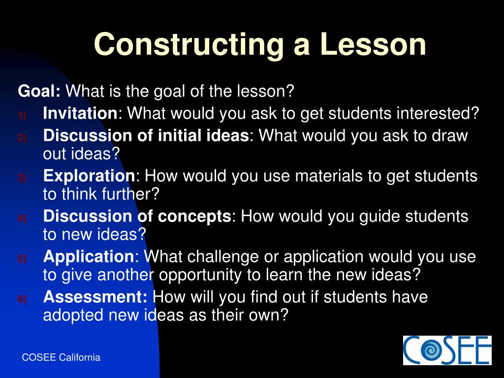 Constructing a Lesson Goal: What is the goal of the lesson? • Invitation: What would you ask to get students interested? • Discussion of initial ideas: What would you ask to draw out ideas? • Exploration: How would you use materials to get students to think further? • Discussion of concepts: How would you guide students to new ideas? • Application: What challenge or application would you use to give another opportunity to learn the new ideas? • Assessment: How will you find out if students have adopted new ideas as their own?