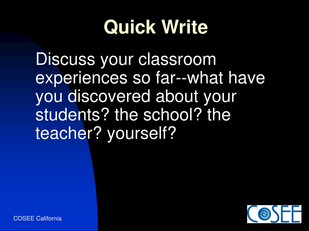 Quick Write Discuss your classroom experiences so far--what have you discovered about your students? the school? the teacher? yourself?