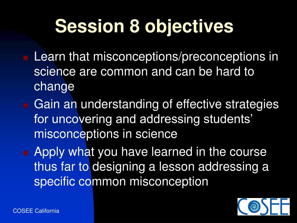 Session 8 objectives • Learn that misconceptions/preconceptions in science are common and can be hard to change • Gain an understanding of effective strategies for uncovering and addressing students’ misconceptions in science • Apply what you have learned in the course thus far to designing a lesson addressing a specific common misconception