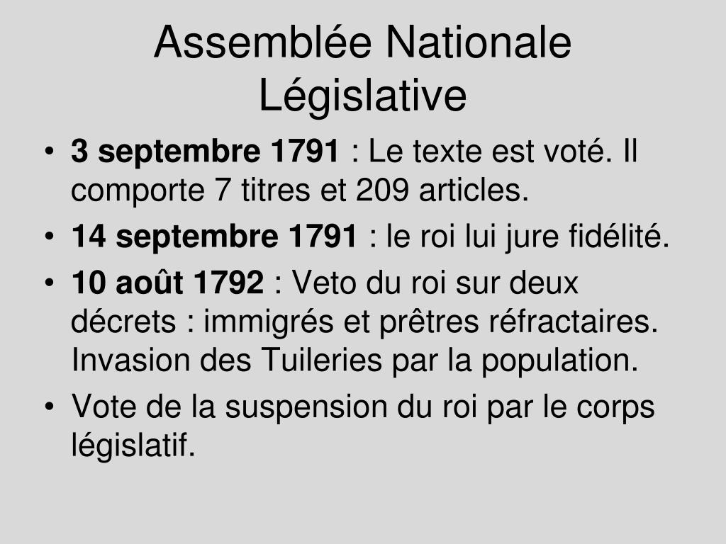 Assemblée Nationale Législative • 3 septembre 1791 : Le texte est voté. Il comporte 7 titres et 209 articles. • 14 septembre 1791 : le roi lui jure fidélité. • 10 août 1792 : Veto du roi sur deux décrets : immigrés et prêtres réfractaires. Invasion des Tuileries par la population. • Vote de la suspension du roi par le corps législatif.