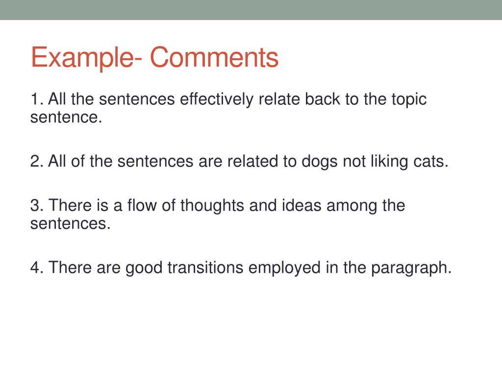 Example- Comments 1. All the sentences effectively relate back to the topic sentence. 2. All of the sentences are related to dogs not liking cats. 3. There is a flow of thoughts and ideas among the sentences. 4. There are good transitions employed in the paragraph.