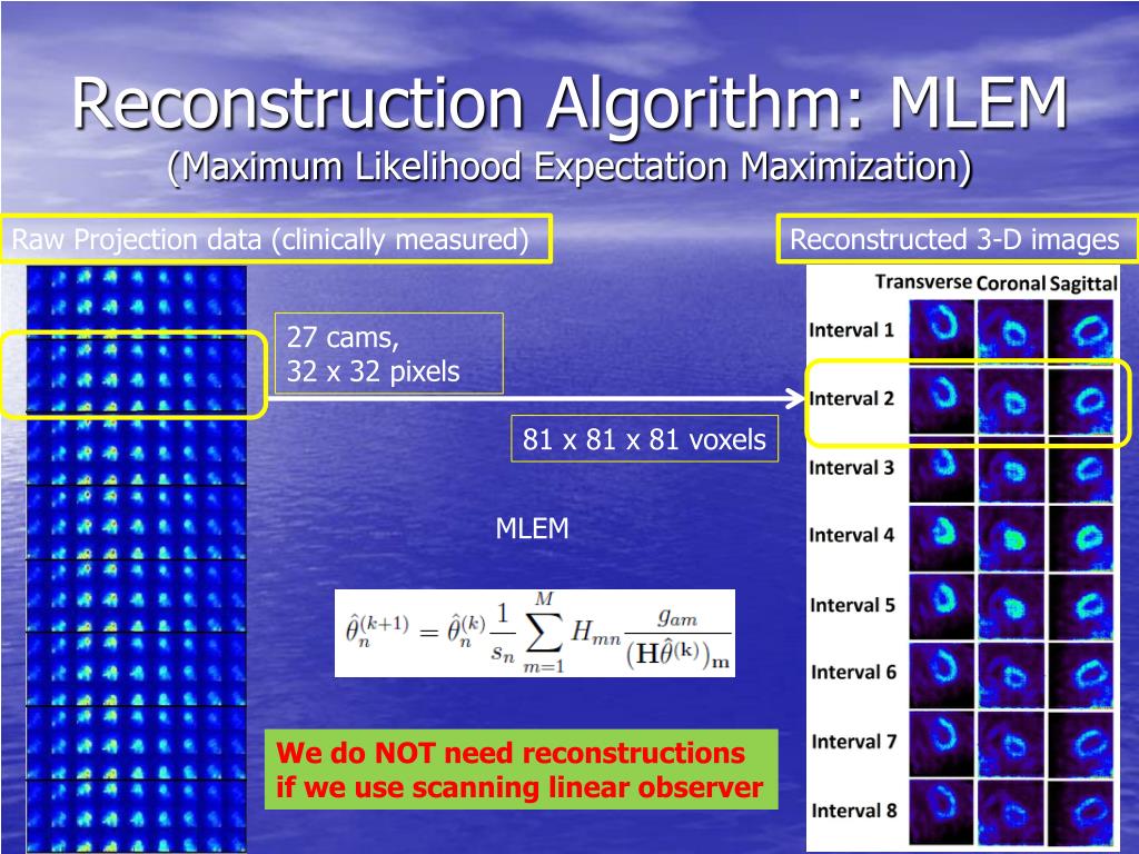 Reconstruction Algorithm: MLEM(Maximum Likelihood Expectation Maximization) Raw Projection data (clinically measured) Reconstructed 3-D images 27 cams, 32 x 32 pixels 81 x 81 x 81 voxels MLEM We do NOT need reconstructions if we use scanning linear observer