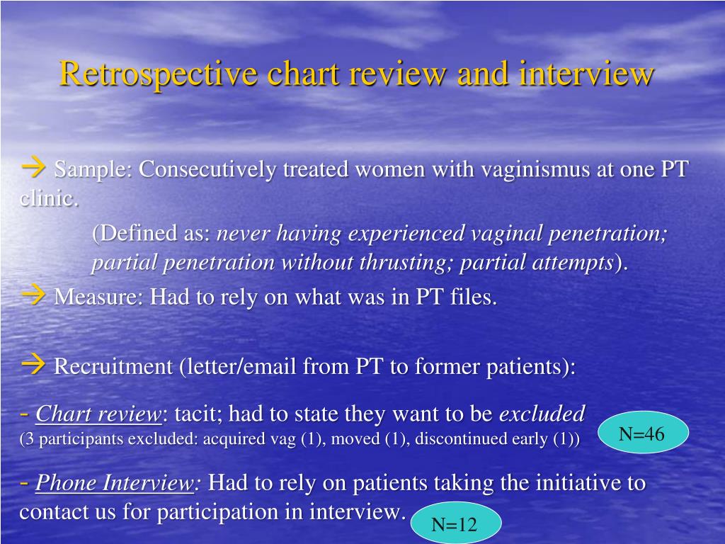 Retrospective chart review and interview Sample: Consecutively treated women with vaginismus at one PT clinic. (Defined as: never having experienced vaginal penetration; partial penetration without thrusting; partial attempts). Measure: Had to rely on what was in PT files. Recruitment (letter/email from PT to former patients): Chart review: tacit; had to state they want to be excluded (3 participants excluded: acquired vag (1), moved (1), discontinued early (1)) PhoneInterview: Had to rely on patients taking the initiative to contact us for participation in interview. N=46 N=12