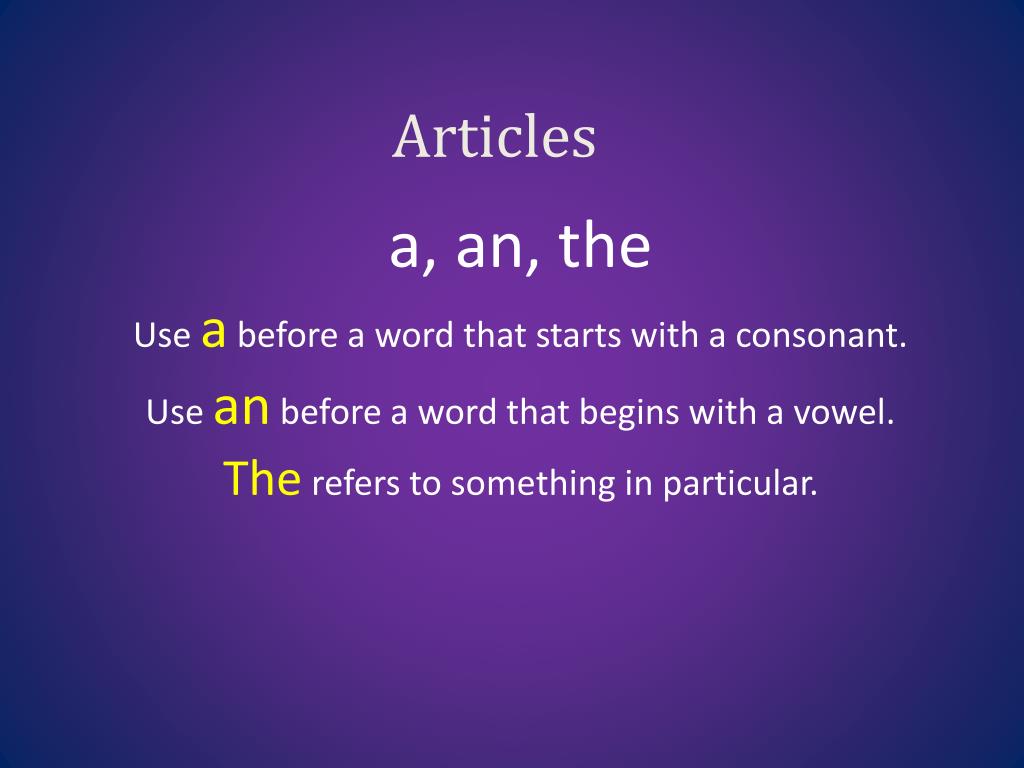 Articles a, an, the Use a before a word that starts with a consonant. Use an before a word that begins with a vowel. The refers to something in particular.