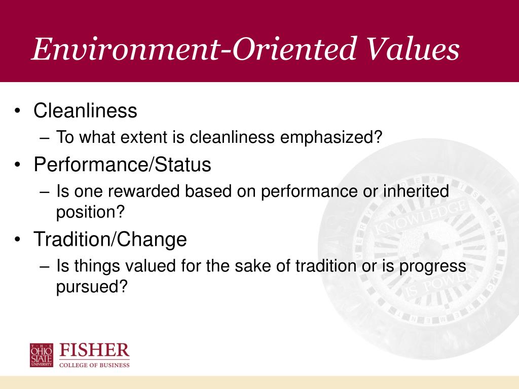 Environment-Oriented Values • Cleanliness • To what extent is cleanliness emphasized? • Performance/Status • Is one rewarded based on performance or inherited position? • Tradition/Change • Is things valued for the sake of tradition or is progress pursued?