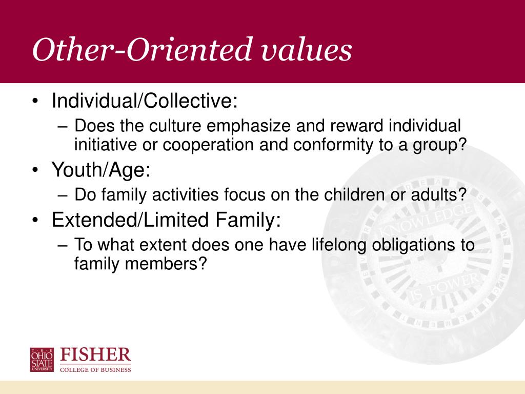 Other-Oriented values • Individual/Collective: • Does the culture emphasize and reward individual initiative or cooperation and conformity to a group? • Youth/Age: • Do family activities focus on the children or adults? • Extended/Limited Family: • To what extent does one have lifelong obligations to family members?