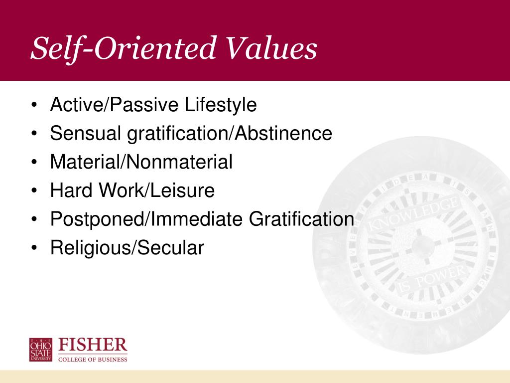 Self-Oriented Values • Active/Passive Lifestyle • Sensual gratification/Abstinence • Material/Nonmaterial • Hard Work/Leisure • Postponed/Immediate Gratification • Religious/Secular