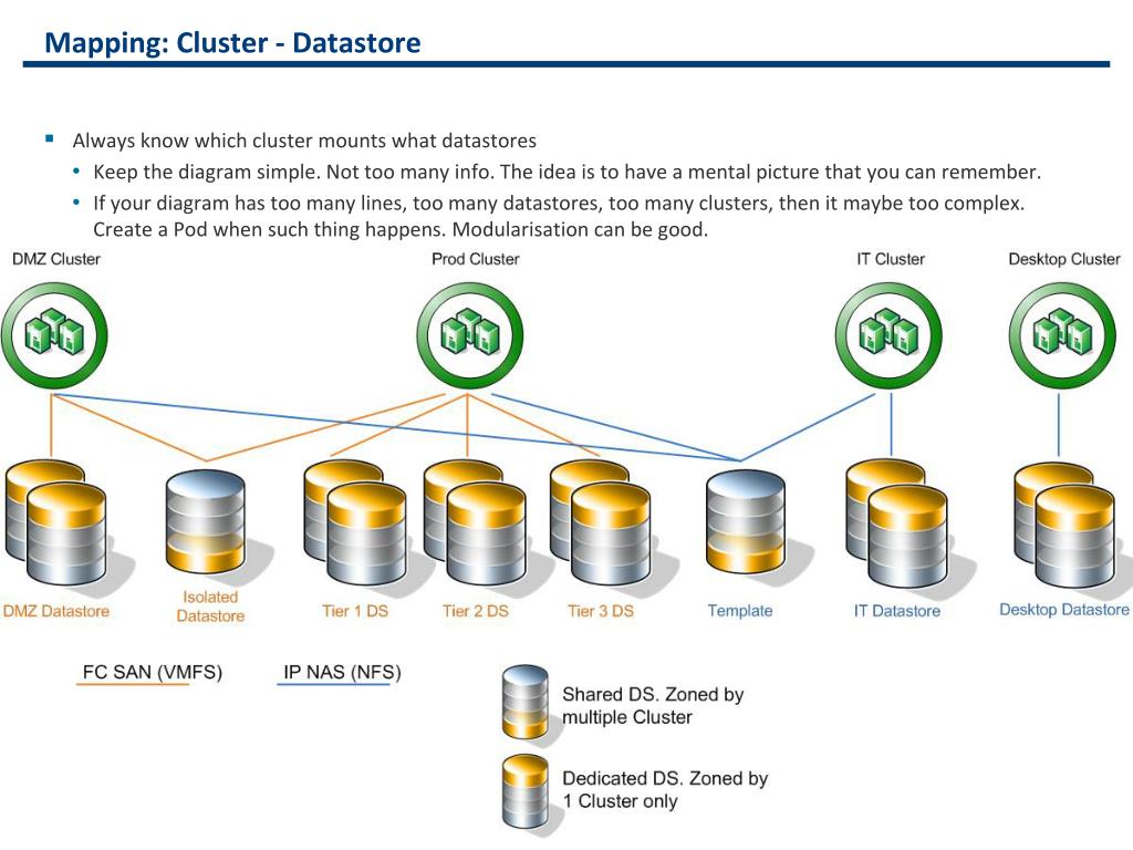 Mapping: Cluster - Datastore • Always know which cluster mounts what datastores • Keep the diagram simple. Not too many info. The idea is to have a mental picture that you can remember. • If your diagram has too many lines, too many datastores, too many clusters, then it maybe too complex. Create a Pod when such thing happens. Modularisation can be good.
