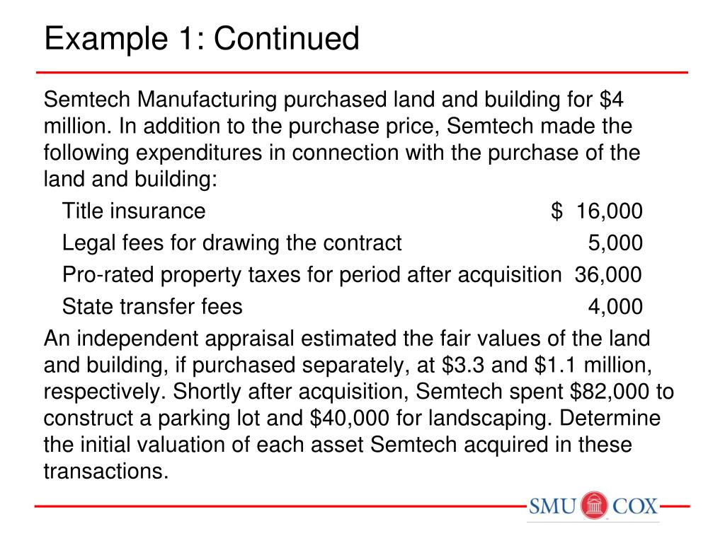 Example 1: Continued Semtech Manufacturing purchased land and building for $4 million. In addition to the purchase price, Semtech made the following expenditures in connection with the purchase of the land and building: Title insurance $ 16,000 Legal fees for drawing the contract 5,000 Pro-rated property taxes for period after acquisition 36,000 State transfer fees 4,000 An independent appraisal estimated the fair values of the land and building, if purchased separately, at $3.3 and $1.1 million, respectively. Shortly after acquisition, Semtech spent $82,000 to construct a parking lot and $40,000 for landscaping. Determine the initial valuation of each asset Semtech acquired in these transactions.