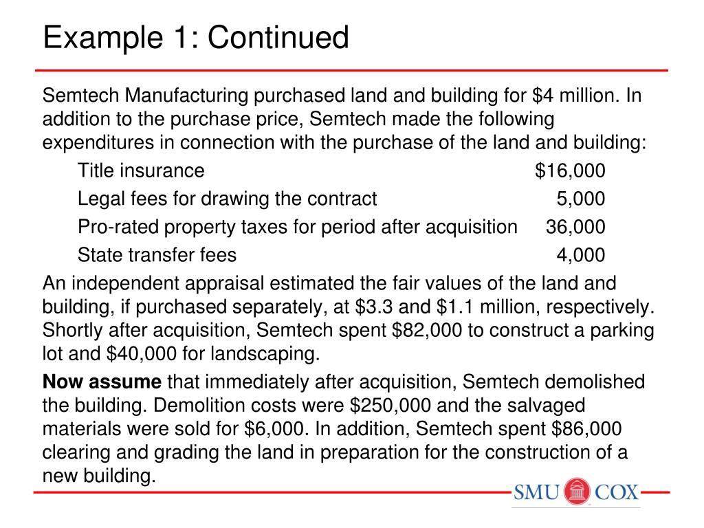 Example 1: Continued Semtech Manufacturing purchased land and building for $4 million. In addition to the purchase price, Semtech made the following expenditures in connection with the purchase of the land and building: Title insurance $16,000 Legal fees for drawing the contract 5,000 Pro-rated property taxes for period after acquisition 36,000 State transfer fees 4,000 An independent appraisal estimated the fair values of the land and building, if purchased separately, at $3.3 and $1.1 million, respectively. Shortly after acquisition, Semtech spent $82,000 to construct a parking lot and $40,000 for landscaping. Now assume that immediately after acquisition, Semtech demolished the building. Demolition costs were $250,000 and the salvaged materials were sold for $6,000. In addition, Semtech spent $86,000 clearing and grading the land in preparation for the construction of a new building.