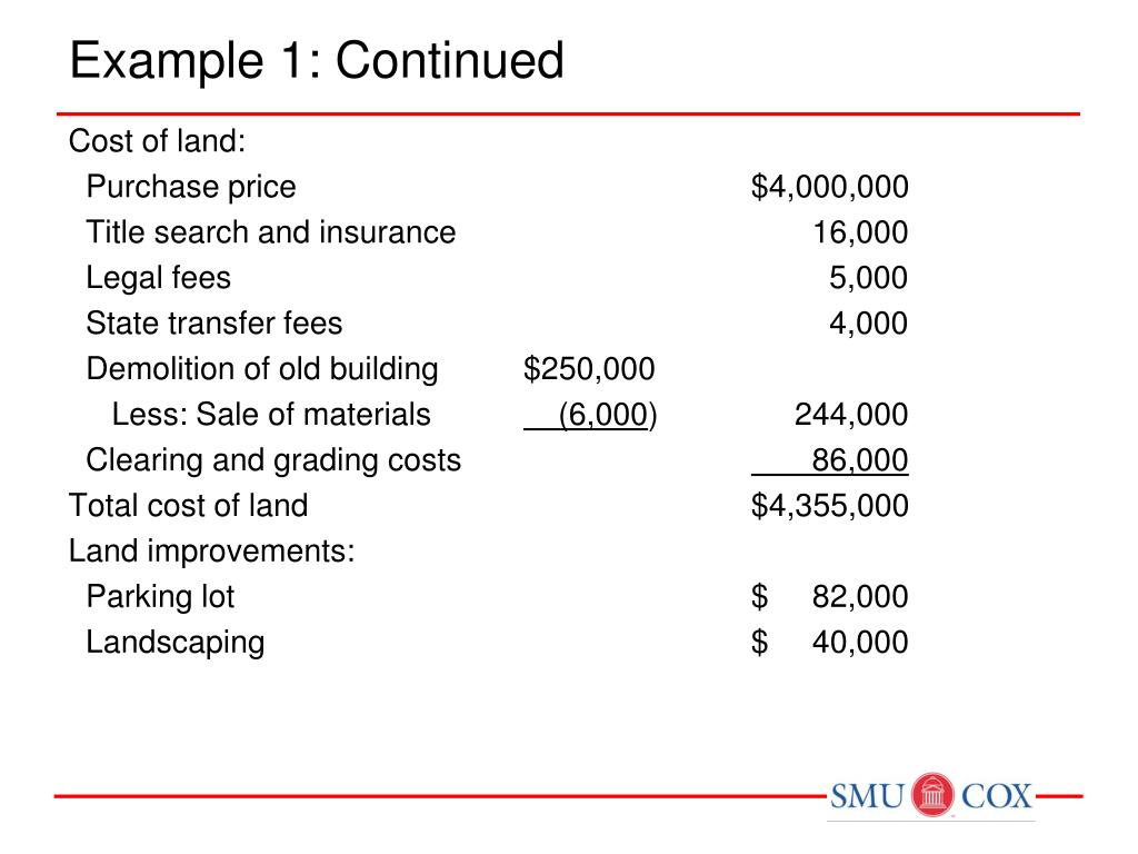 Example 1: Continued Cost of land: Purchase price $4,000,000 Title search and insurance 16,000 Legal fees 5,000 State transfer fees 4,000 Demolition of old building $250,000 Less: Sale of materials (6,000) 244,000 Clearing and grading costs 86,000 Total cost of land $4,355,000 Land improvements: Parking lot $ 82,000 Landscaping $ 40,000