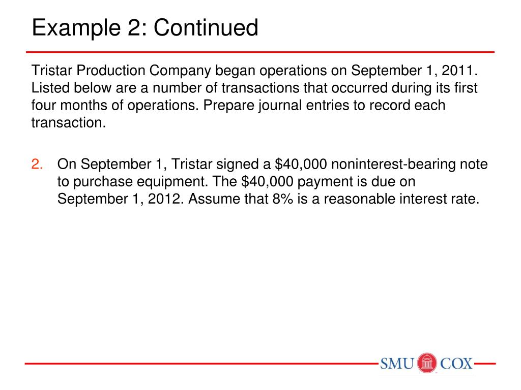 Example 2: Continued Tristar Production Company began operations on September 1, 2011. Listed below are a number of transactions that occurred during its first four months of operations.Prepare journal entries to record each transaction. • On September 1, Tristar signed a $40,000 noninterest-bearing note to purchase equipment. The $40,000 payment is due on September 1, 2012. Assume that 8% is a reasonable interest rate.