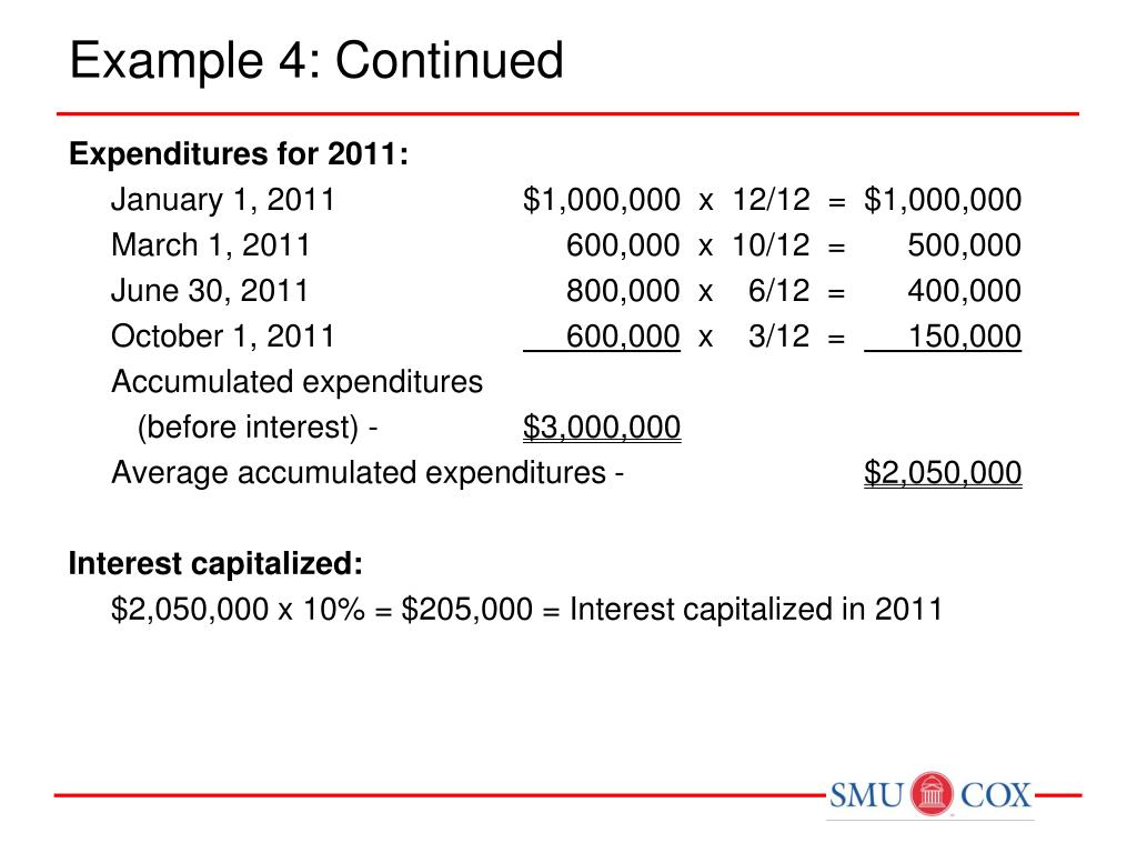 Example 4: Continued Expenditures for 2011: January 1, 2011 $1,000,000 x 12/12 = $1,000,000 March 1, 2011 600,000 x 10/12 = 500,000 June 30, 2011 800,000 x 6/12 = 400,000 October 1, 2011 600,000 x 3/12 = 150,000 Accumulated expenditures (before interest) - $3,000,000 Average accumulated expenditures - $2,050,000 Interest capitalized: $2,050,000 x 10% = $205,000 = Interest capitalized in 2011