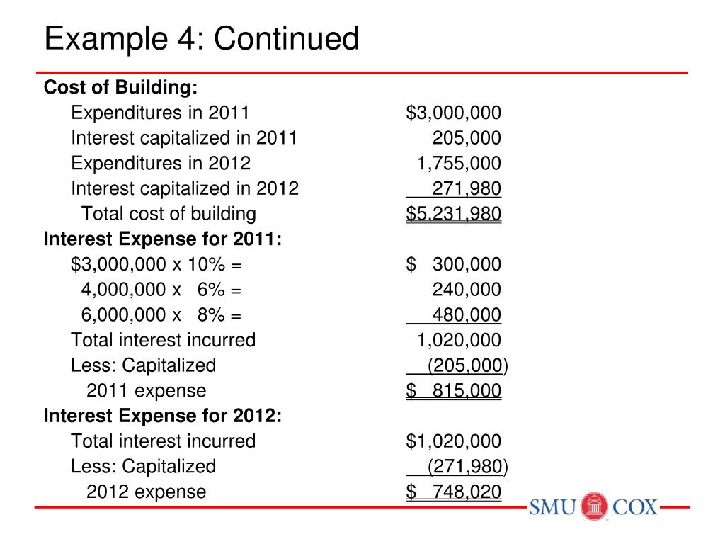 Example 4b: Continued Cost of Building: Expenditures in 2011 $3,000,000 Interest capitalized in 2011 160,925 Expenditures in 2012 1,755,000 Interest capitalized in 2012 225,251 Total cost of building $5,141,176 Interest Expense for 2011: Total interest incurred $1,020,000 Less: Capitalized (160,925) 2011 expense $ 859,075 Interest Expense for 2012: Total interest incurred $1,020,000 Less: Capitalized (225,251) 2012 expense $ 794,749