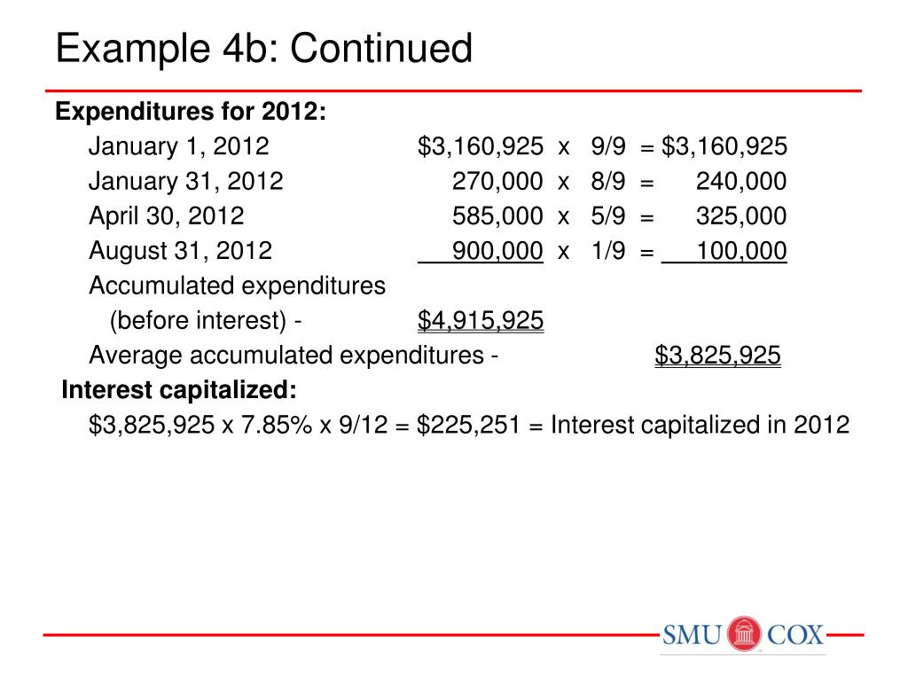 Example 4b: Continued Expenditures for 2012: January 1, 2012 $3,160,925 x 9/9 = $3,160,925 January 31, 2012 270,000 x 8/9 = 240,000 April 30, 2012 585,000 x 5/9 = 325,000 August 31, 2012 900,000 x 1/9 = 100,000 Accumulated expenditures (before interest) - $4,915,925 Average accumulated expenditures - $3,825,925 Interest capitalized: $3,825,925 x 7.85% x 9/12 = $225,251 = Interest capitalized in 2012