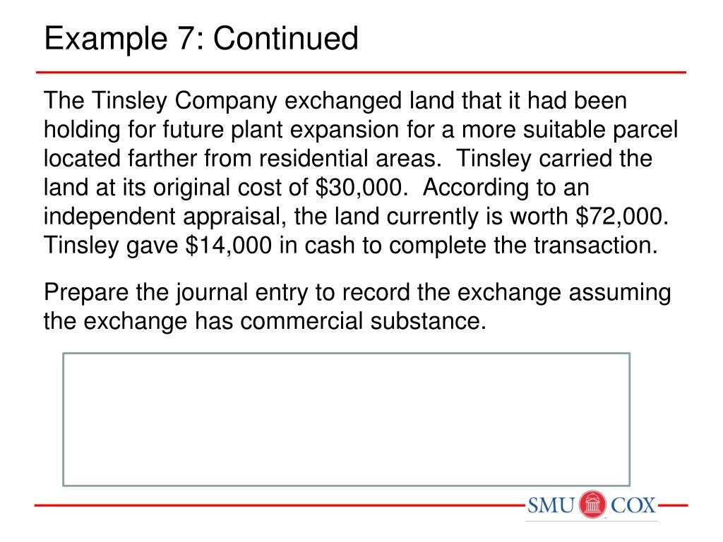 Example 7: Continued The Tinsley Company exchanged land that it had been holding for future plant expansion for a more suitable parcel located farther from residential areas. Tinsley carried the land at its original cost of $30,000. According to an independent appraisal, the land currently is worth $72,000. Tinsley gave $14,000 in cash to complete the transaction. Prepare the journal entry to record the exchange assuming the exchange lacks commercial substance.