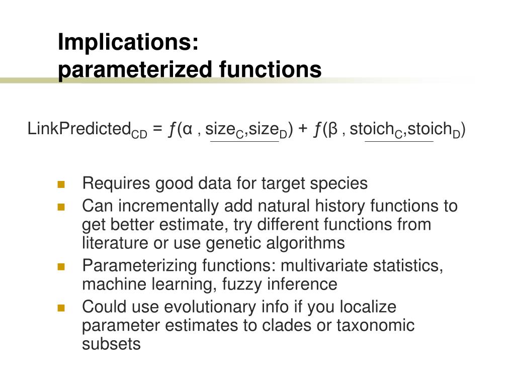 Implications: parameterized functions LinkPredictedCD = ƒ(α, sizeC,sizeD) + ƒ(β , stoichC,stoichD) • Requires good data for target species • Can incrementally add natural history functions to get better estimate, try different functions from literature or use genetic algorithms • Parameterizing functions: multivariate statistics, machine learning, fuzzy inference • Could use evolutionary info if you localize parameter estimates to clades or taxonomic subsets