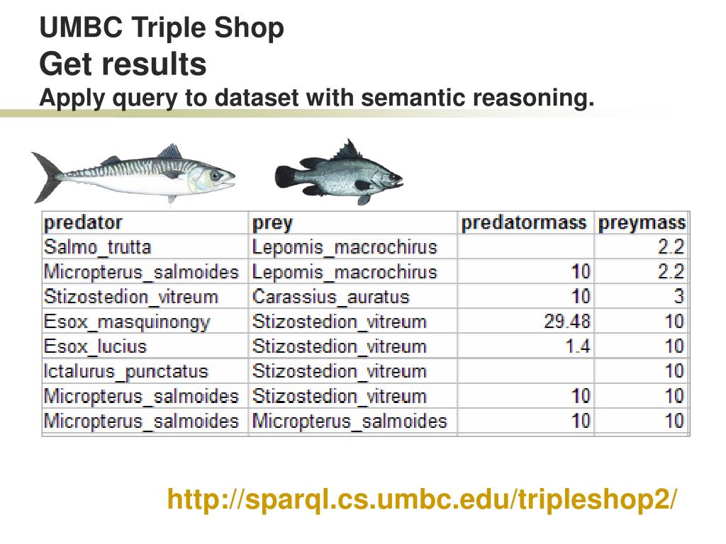 Esox_lucius.owl webs_publisher.php? published_study=11 Actinopterygii.owl UMBC Triple ShopCreate a datasetFind semantic web docs that can answer query. http://swoogle.umbc.edu