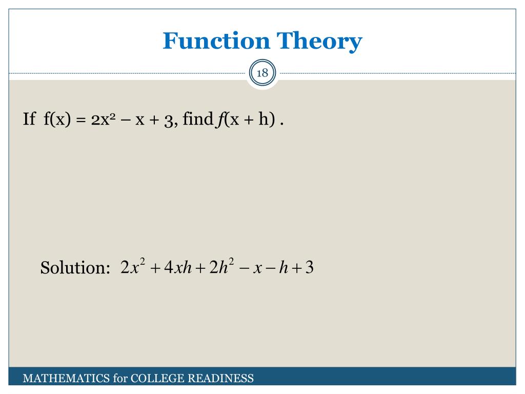 Function Theory If f(x) = 2x2 – x + 3, find f(x + h) . Solution: MATHEMATICS for COLLEGE READINESS