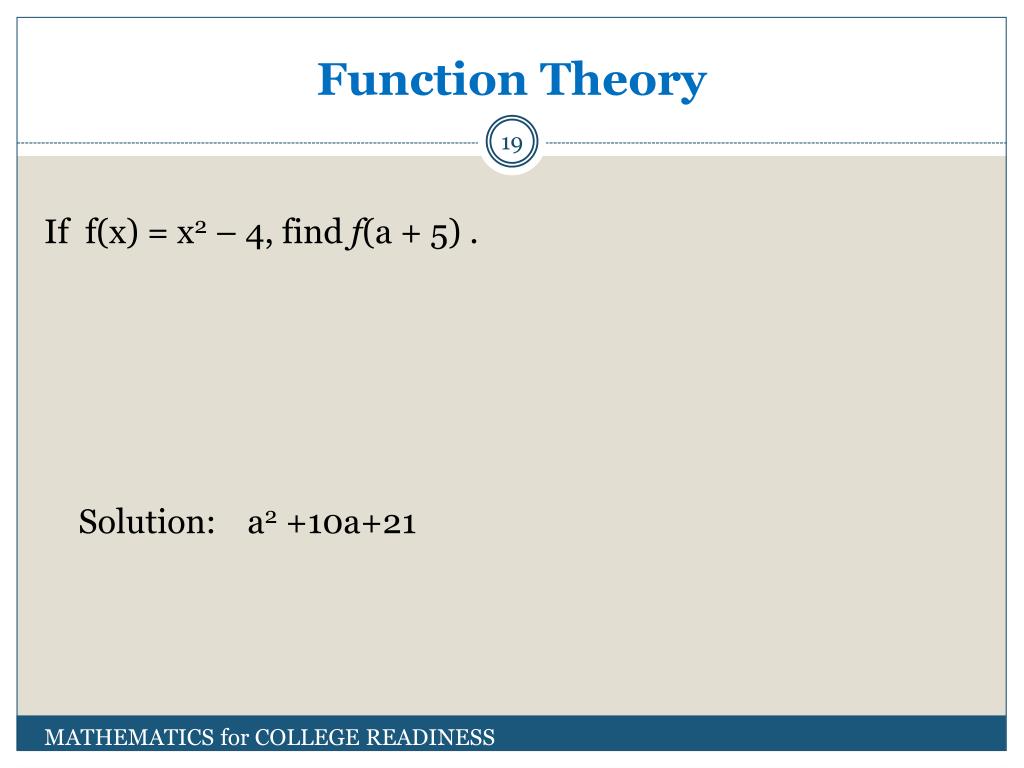 Function Theory If f(x) = x2 – 4, find f(a + 5) . Solution: a2 +10a+21 MATHEMATICS for COLLEGE READINESS