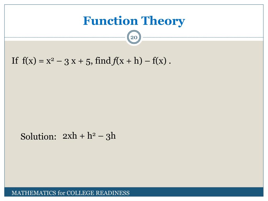 Function Theory If f(x) = x2 – 3 x + 5, find f(x + h) – f(x) . 2xh + h2– 3h Solution: MATHEMATICS for COLLEGE READINESS