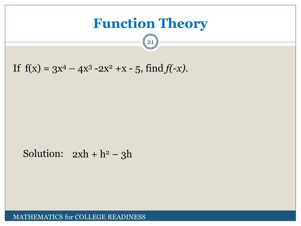Function Theory If f(x) = 3x4 – 4x3 -2x2 +x - 5, find f(-x). Solution: 2xh + h2– 3h MATHEMATICS for COLLEGE READINESS