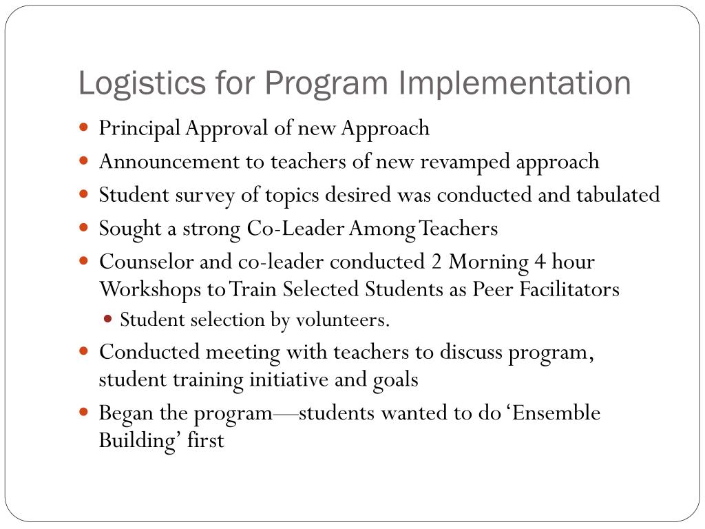 Logistics for Program Implementation • Principal Approval of new Approach • Announcement to teachers of new revamped approach • Student survey of topics desired was conducted and tabulated • Sought a strong Co-Leader Among Teachers • Counselor and co-leader conducted 2 Morning 4 hour Workshops to Train Selected Students as Peer Facilitators • Student selection by volunteers. • Conducted meeting with teachers to discuss program, student training initiative and goals • Began the program—students wanted to do ‘Ensemble Building’ first