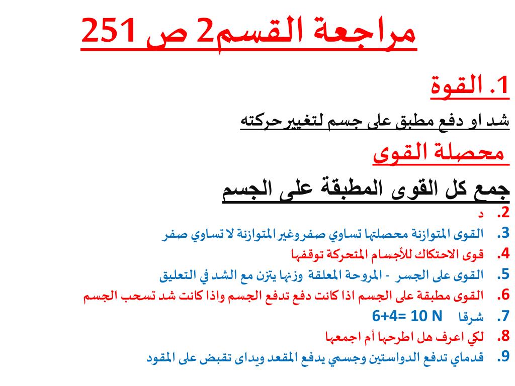 مراجعة القسم2 ص 251 • 1. القوة • شد او دفع مطبق على جسم لتغيير حركته • محصلة القوى • جمع كل القوى المطبقة على الجسم • د • القوى المتوازنة محصلتها تساوي صفر وغير المتوازنة لا تساوي صفر • قوى الاحتكاك للأجسام المتحركة توقفها • القوى على الجسر - المروحة المعلقة وزنها يتزن مع الشد في التعليق • القوى مطبقة على الجسم اذا كانت دفع تدفع الجسم واذا كانت شد تسحب الجسم • شرقا 6+4= 10 N • لكي اعرف هل اطرحها أم اجمعها • قدماي تدفع الدواستين وجسمي يدفع المقعد ويداى تقبض على المقود