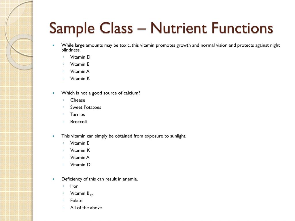 Sample Class – Nutrient Functions • While large amounts may be toxic, this vitamin promotes growth and normal vision and protects against night blindness. • Vitamin D • Vitamin E • Vitamin A • Vitamin K • Which is not a good source of calcium? • Cheese • Sweet Potatoes • Turnips • Broccoli • This vitamin can simply be obtained from exposure to sunlight. • Vitamin E • Vitamin K • Vitamin A • Vitamin D • Deficiency of this can result in anemia. • Iron • Vitamin B12 • Folate • All of the above