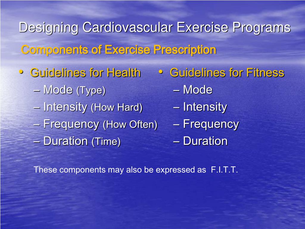 Guidelines for Health Mode (Type) Intensity (How Hard) Frequency (How Often) Duration (Time) Guidelines for Fitness Mode Intensity Frequency Duration Designing Cardiovascular Exercise Programs Components of Exercise Prescription These components may also be expressed as F.I.T.T.