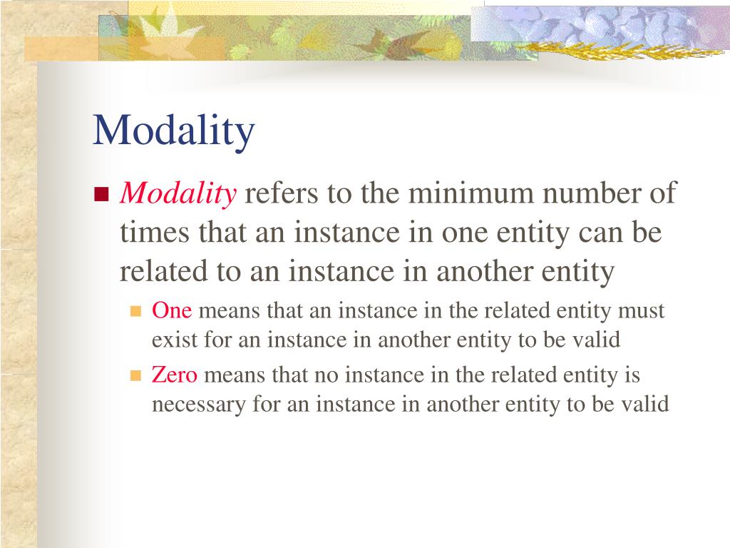 Modality refers to the minimum number of times that an instance in one entity can be related to an instance in another entity One means that an instance in the related entity must exist for an instance in another entity to be valid Modality