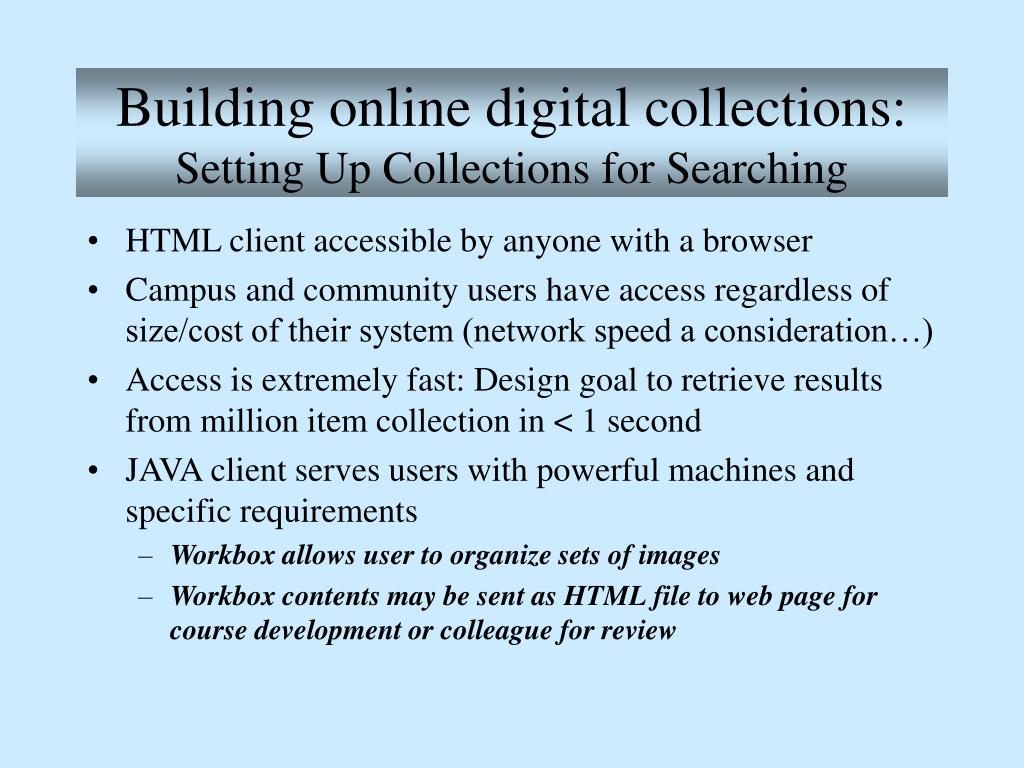 Building online digital collections: Setting Up Collections for Searching • HTML client accessible by anyone with a browser • Campus and community users have access regardless of size/cost of their system (network speed a consideration…) • Access is extremely fast: Design goal to retrieve results from million item collection in < 1 second • JAVA client serves users with powerful machines and specific requirements • Workbox allows user to organize sets of images • Workbox contents may be sent as HTMLfile to web page for course development or colleague for review