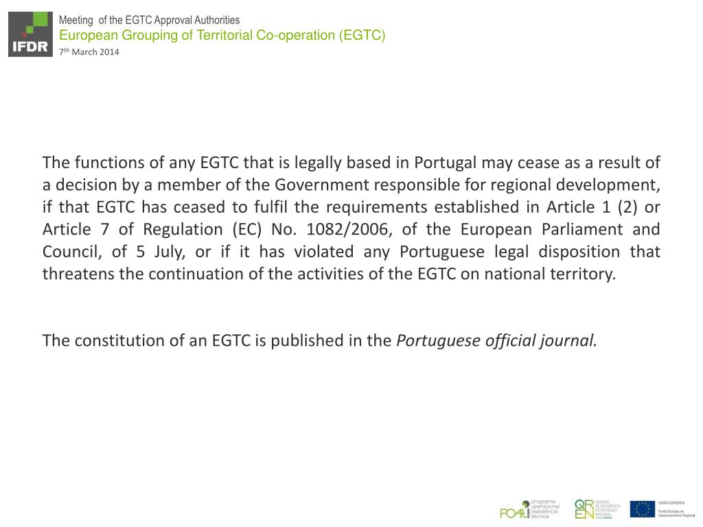 The functions of any EGTC that is legally based in Portugal may cease as a result of a decision by a member of the Government responsible for regional development, if that EGTC has ceased to fulfil the requirements established in Article 1 (2) or Article 7 of Regulation (EC) No. 1082/2006, of the European Parliament and Council, of 5 July, or if it has violated any Portuguese legal disposition that threatens the continuation of the activities of the EGTC on national territory. The constitution of an EGTC is published in the Portuguese official journal.