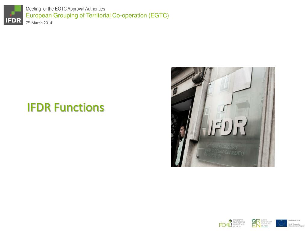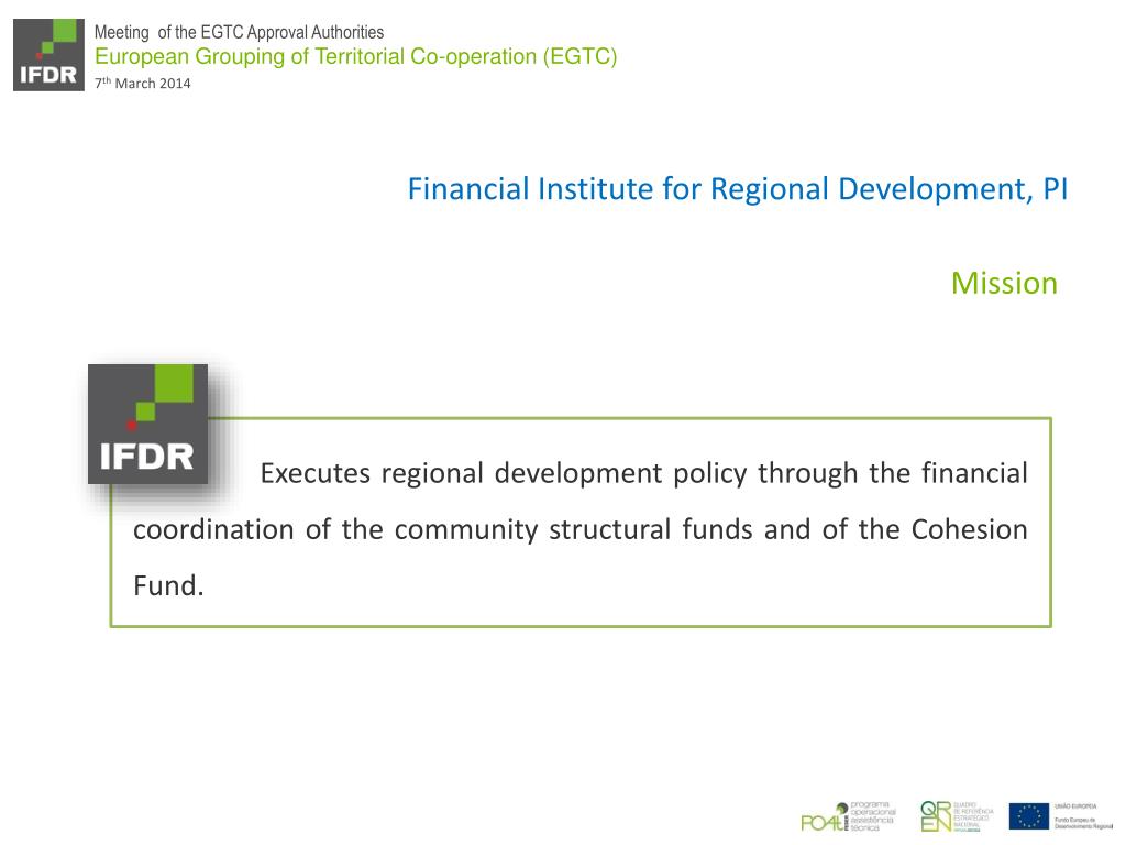 European Grouping of Territorial Co-operation (EGTC ) The 3 rd Meeting of the EGTC Approval Authorities Financial Institute for Regional Development, PI Dina Ferreira March 7, 2014, Budapest. IFDR Functions . Mission. Financial Institute for Regional Development , PI.