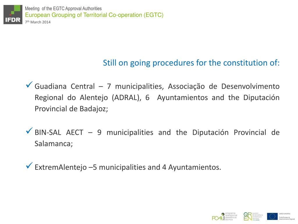 Stillongoingprocedures for theconstitutionof: • Guadiana Central – 7 municipalities, Associação de Desenvolvimento Regional do Alentejo (ADRAL), 6 AyuntamientosandtheDiputación Provincial de Badajoz; • BIN-SAL AECT – 9 municipalitiesandtheDiputación Provincial de Salamanca; • ExtremAlentejo –5 municipalitiesand 4 Ayuntamientos.