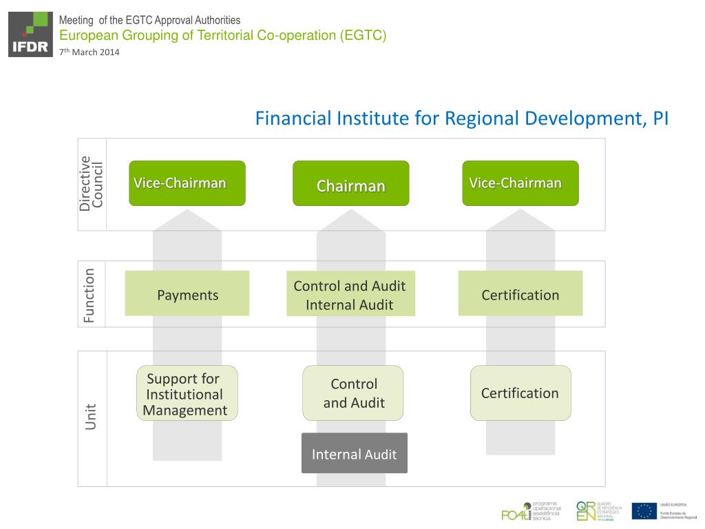 Financial Institute for Regional Development, PI Vice-Chairman Vice-Chairman Chairman Directive Council Control and Audit Payments Certification Function Internal Audit Support for ControlandAudit Certification Institutional Management Unit InternalAudit