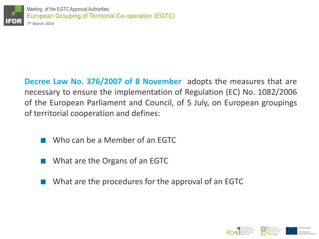 DecreeLaw No. 376/2007 of 8 Novemberadopts the measures that are necessary to ensure the implementation of Regulation (EC) No. 1082/2006 of the European Parliament and Council, of 5 July, on European groupings of territorial cooperation and defines: • Who can be a Member of an EGTC • What are the Organs of an EGTC • What are the procedures for the approval of an EGTC