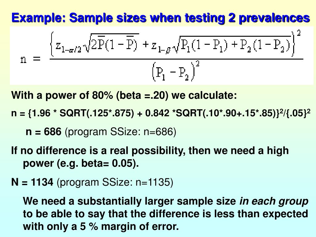 Example: Sample sizes when testing 2 prevalences With a power of 80% (beta =.20) we calculate: n = {1.96 * SQRT(.125*.875) + 0.842 *SQRT(.10*.90+.15*.85)}2/{.05}2 n = 686 (program SSize: n=686) If no difference is a real possibility, then we need a high power (e.g. beta= 0.05). N = 1134 (program SSize: n=1135) We need a substantially larger sample size in each group to be able to say that the difference is less than expected with only a 5 % margin of error.